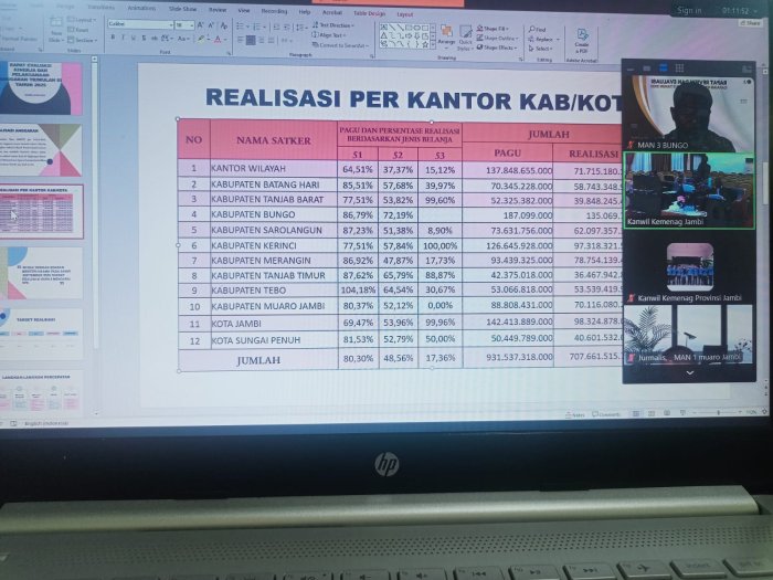 Pelaksanaan evaluasi capaian kinerja secara daring merupakan salah satu upaya Kanwil Kemenag Provinsi Jambi dalam memantau serta meningkatkan efektivitas pelaksanaan program di seluruh satuan kerja, termasuk madrasah. Evaluasi rutin seperti ini diharapkan dapat mendorong setiap satuan kerja untuk melakukan perbaikan dan inovasi yang diperlukan agar target kinerja tahun 2025 dapat tercapai dengan baik.