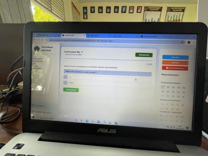 Pengisian instrumen UKS dilakukan secara rutin untuk memastikan bahwa seluruh aspek kesehatan di sekolah terpantau dengan baik. Instrumen tersebut mencakup berbagai indikator, seperti ketersediaan fasilitas kesehatan, kebersihan lingkungan madrasah, kebersihan WC, Kebersihan Air, serta pelaksanaan program kesehatan seperti pemeriksaan kesehatan berkala dan edukasi perilaku hidup bersih dan sehat dengan puskesmas sekitar.