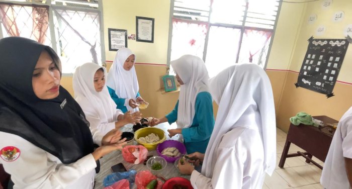 Selama kegiatan berlangsung, para siswa tampak antusias dan aktif bekerja sama dalam kelompok. Mereka mempraktikkan seluruh tahapan pengolahan makanan, mulai dari persiapan bahan, pembuatan adonan, proses memasak, hingga penyajian produk. Seluruh proses dilakukan dengan memperhatikan aspek kebersihan, kerapian, dan keselamatan kerja.