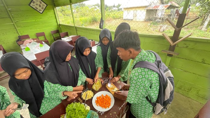 Suasana kegiatan berlangsung aktif dan menyenangkan. Siswa terlihat serius namun tetap menikmati setiap proses, mulai dari mempersiapkan bahan hingga mencicipi hasil olahan mereka bersama teman kelompok.