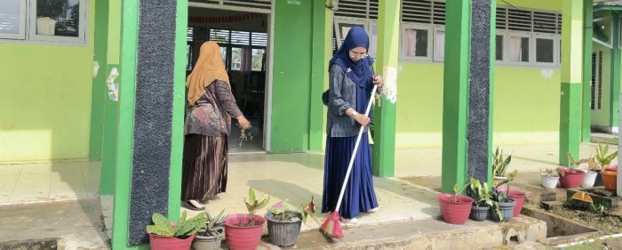 Penataan Lingkungan Luar: Pembersihan halaman madrasah, saluran air, dan taman untuk menciptakan suasana yang asri dan tenang selama masa ujian.